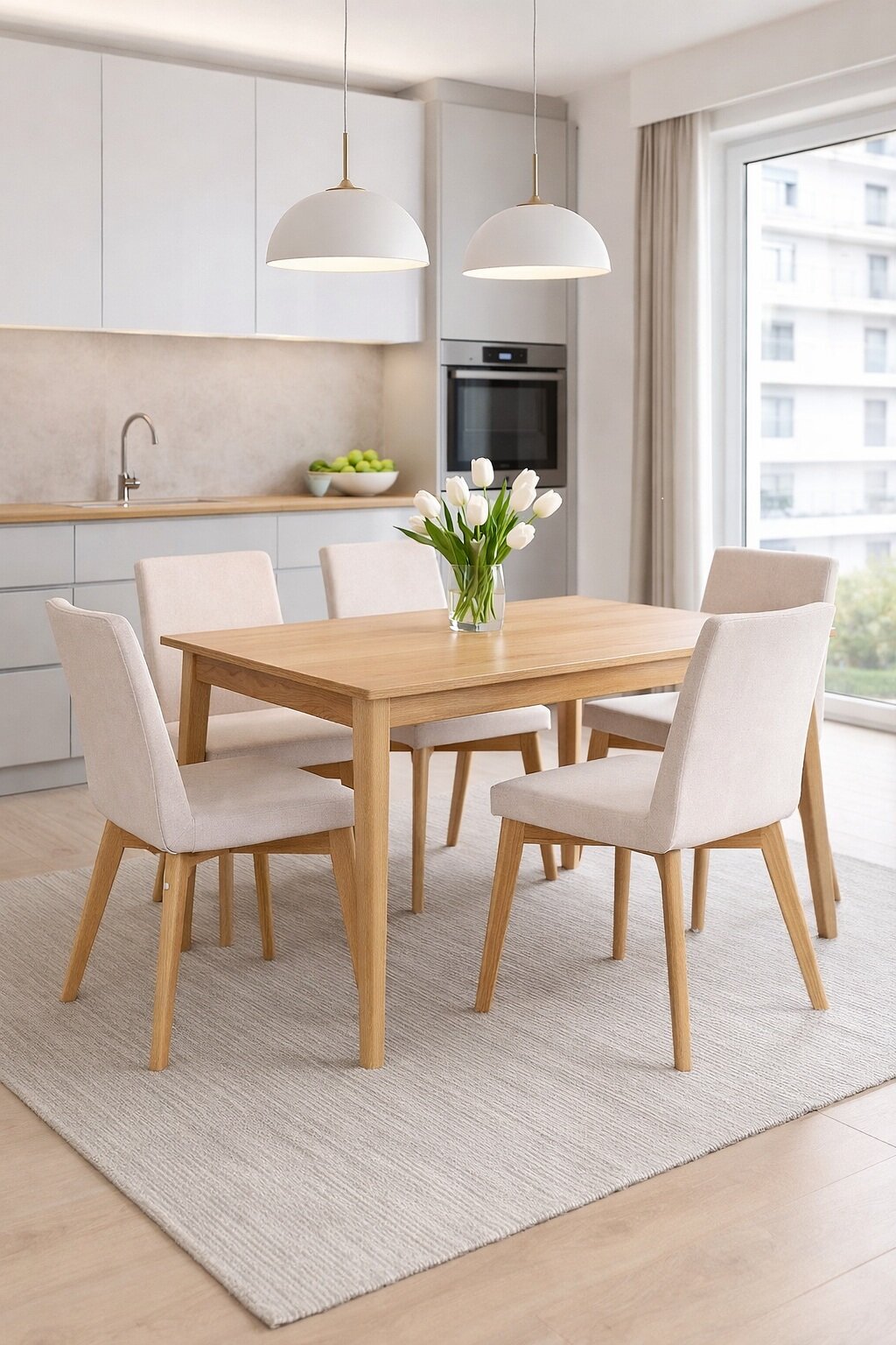 Jedálenská moderná stolička,celočalúnené sedenie aj operák. Operák tvorí kvalitný výlisok z pevnej ale pružnej viacvrstvej lepenky. Sklon chrbátovej časti sa prispôsobí sklonu vášho chrbáta. Veľmi pohodlná stolička,masívna dubová podnož. Vhodnou kombináciou z vodeodolnej látky s masívnym dubovým drevom z nej vyčaríte vkusný doplnok do vašej jedálne. Vyrábame ju aj v ozdobne prešívanej variante.