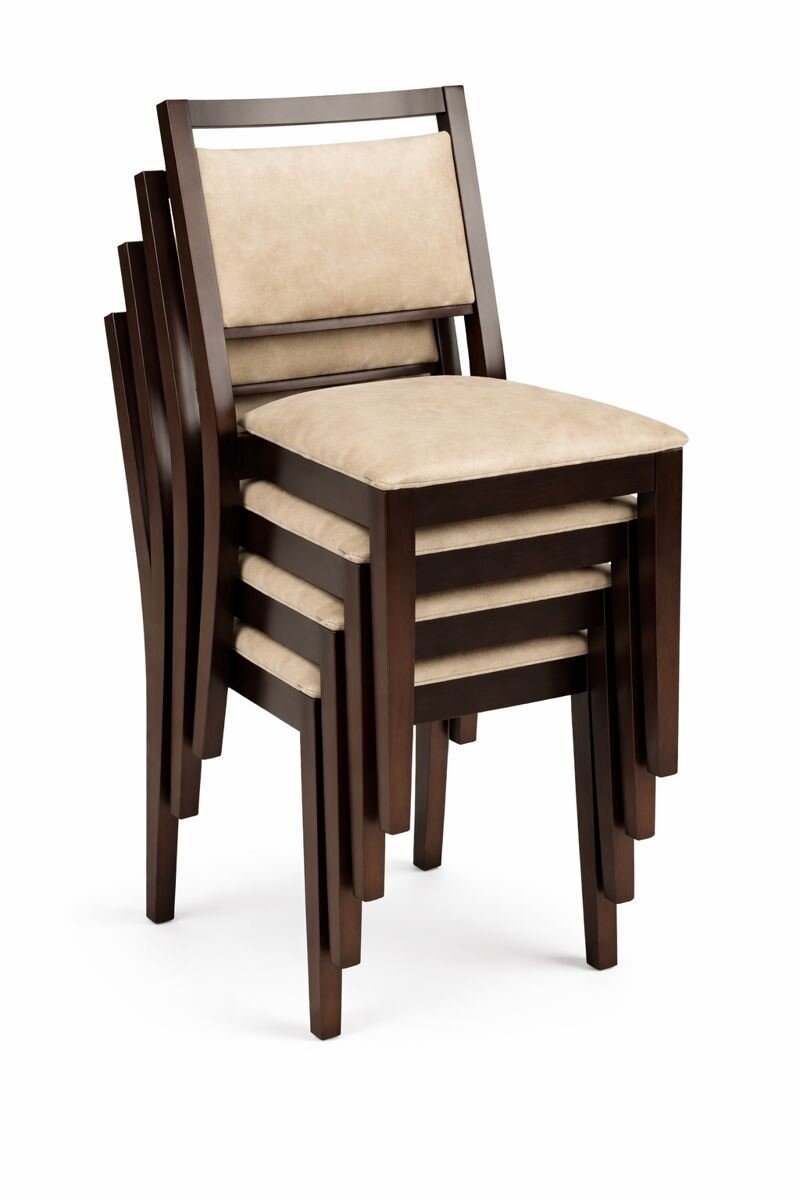 Moderná a praktická stohovateľná stolička je ideálnym riešením pre domácnosti, reštaurácie, konferenčné priestory či zasadacie miestnosti. Vďaka svojmu premyslenému tvaru sa dá jednoducho stohovať až do štyroch kusov, čo ušetrí miesto pri skladovaní a uľahčí manipuláciu. Stolička kombinuje masívnu drevenú konštrukciu v elegantnom tmavom odtieni s pohodlným čalúneným sedadlom a operadlom. Tento nadčasový dizajn zabezpečuje komfort pri sedení a zároveň sa hodí do rôznych typov interiérov – od moderných po klasické