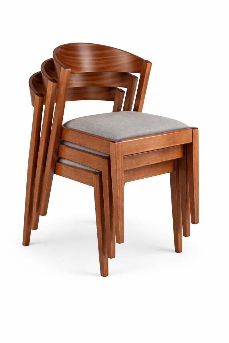 Elegantná a moderná stohovateľná stolička zaujme na prvý pohľad svojím nadčasovým dizajnom a precíznym spracovaním. Vyznačuje sa pevným dreveným rámom s krásnou kresbou dreva a ergonomicky tvarovaným zadným operadlom, ktoré poskytuje maximálny komfort pri sedení. Sedadlo je vybavené mäkkým čalúnením v neutrálnej sivej farbe, vďaka čomu je príjemné na dotyk a vhodné aj na dlhšie sedenie. Vďaka premyslenej konštrukcii je možné stoličky jednoducho stohovať, čo výrazne šetrí priestor pri skladovaní – ideálne riešenie pre reštaurácie, kaviarne, hotely či moderné domácnosti.